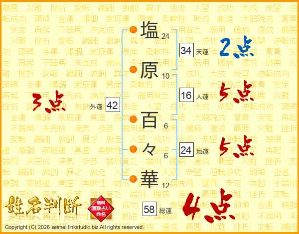 塩(24画)原(10画) 百(6画)々(6画)華(12画)