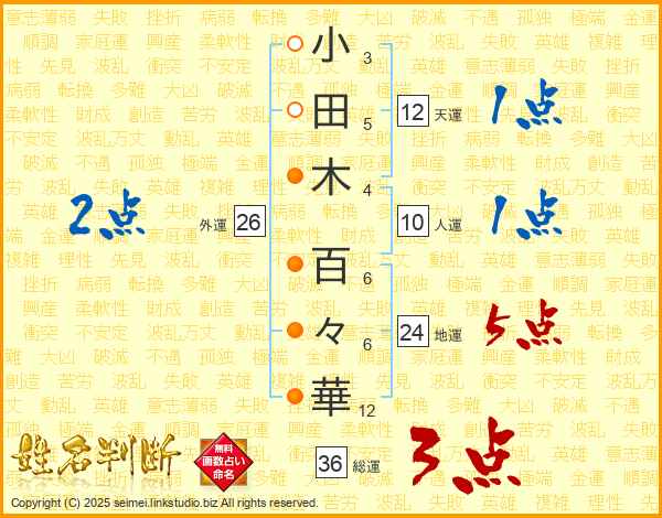 小(3画)田(5画)木(4画) 百(6画)々(6画)華(12画)