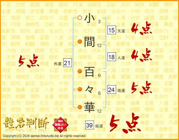 小(3画)間(12画) 百(6画)々(6画)華(12画)