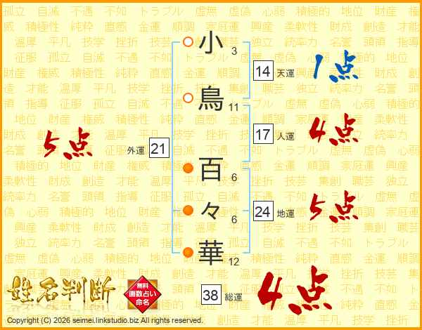 生活面を象徴する運勢です。外部から受ける影響力を表し、結婚運、家庭運や職場、環境への順応性を表します。総運から人運を引いた画数。姓や名が1文字の場合を除く。