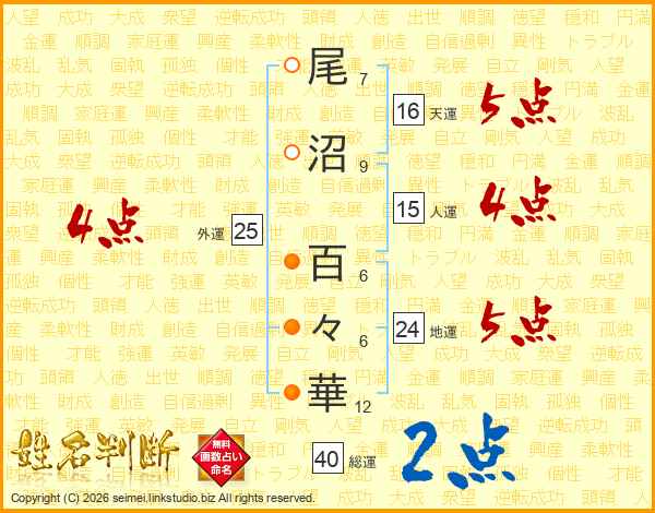 尾(7画)沼(9画) 百(6画)々(6画)華(12画)