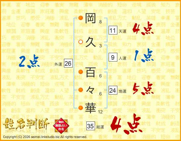岡(8画)久(3画) 百(6画)々(6画)華(12画)