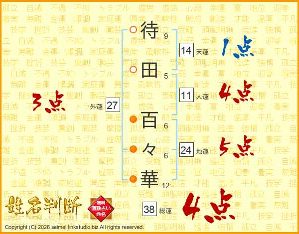 生活面を象徴する運勢です。外部から受ける影響力を表し、結婚運、家庭運や職場、環境への順応性を表します。総運から人運を引いた画数。姓や名が1文字の場合を除く。
