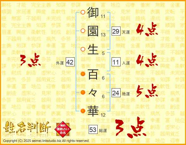 御(11画)園(13画)生(5画) 百(6画)々(6画)華(12画)