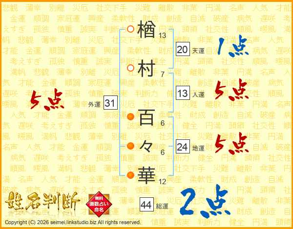 楢(13画)村(7画) 百(6画)々(6画)華(12画)