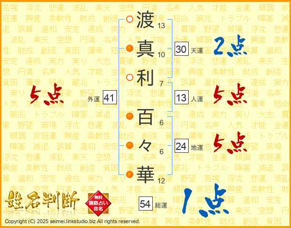 渡(13画)真(10画)利(7画) 百(6画)々(6画)華(12画)