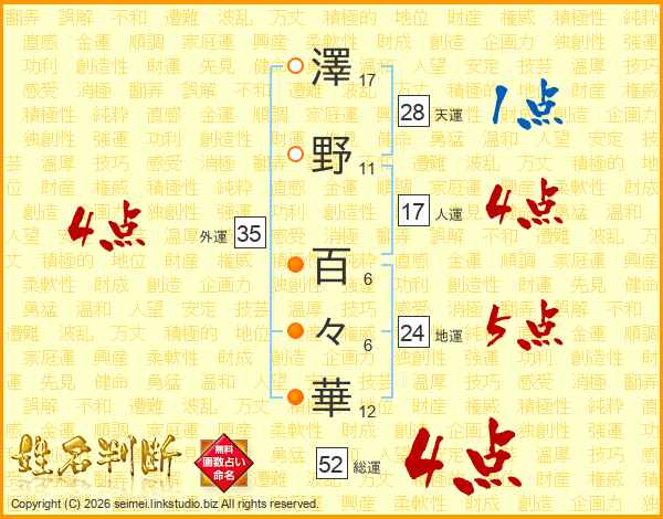 澤(17画)野(11画) 百(6画)々(6画)華(12画)