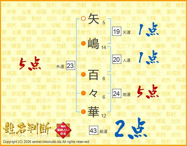 矢(5画)嶋(14画) 百(6画)々(6画)華(12画)