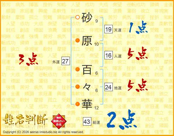 砂原百々華さんの総運は43画の2点!