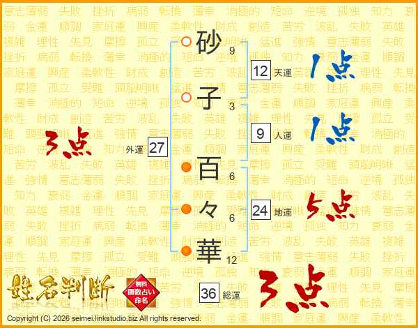 砂子百々華さんの総運は36画の3点!