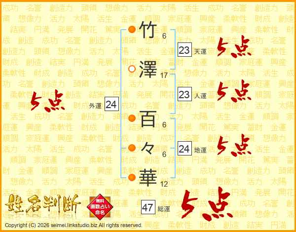 竹(6画)澤(17画) 百(6画)々(6画)華(12画)