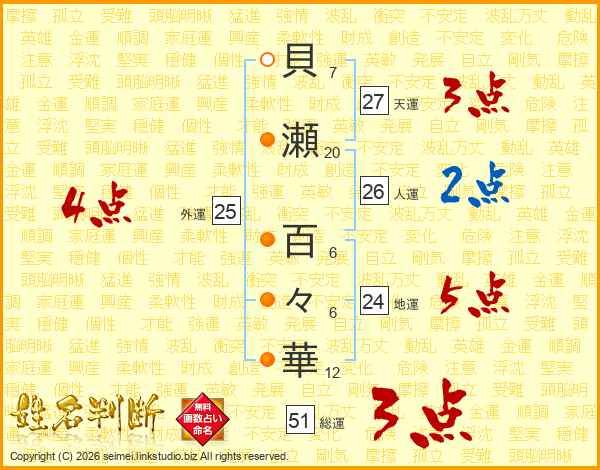 貝瀬百々華さんの総運は51画の3点!