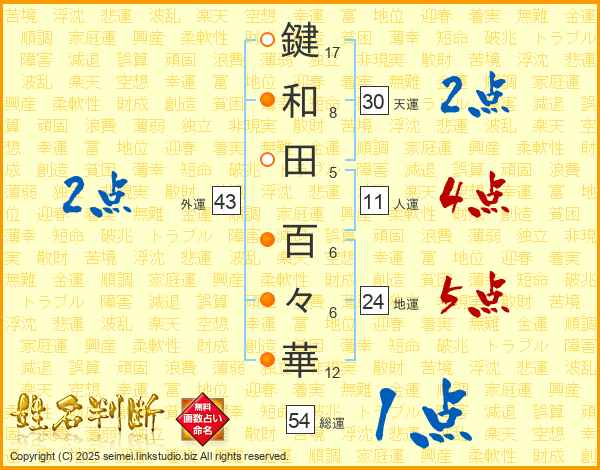 生活面を象徴する運勢です。外部から受ける影響力を表し、結婚運、家庭運や職場、環境への順応性を表します。総運から人運を引いた画数。姓や名が1文字の場合を除く。