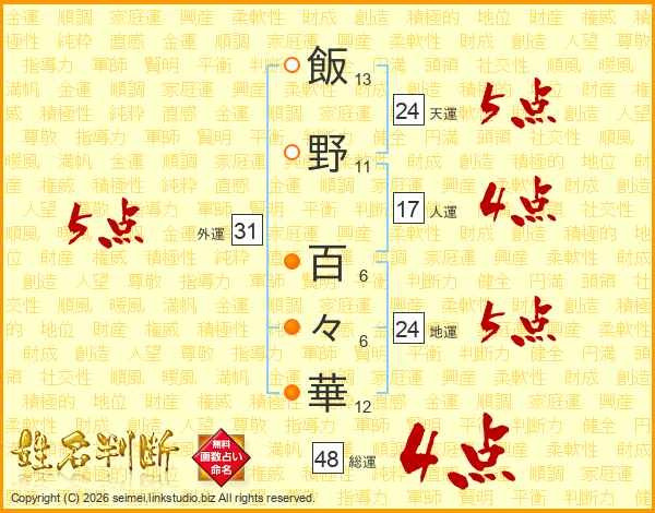 飯(13画)野(11画) 百(6画)々(6画)華(12画)