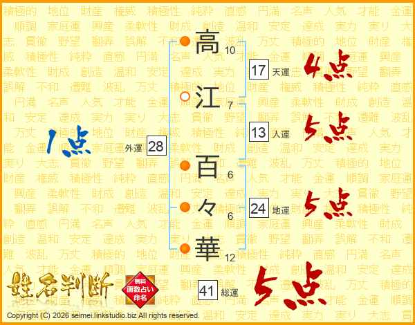 高(10画)江(7画) 百(6画)々(6画)華(12画)