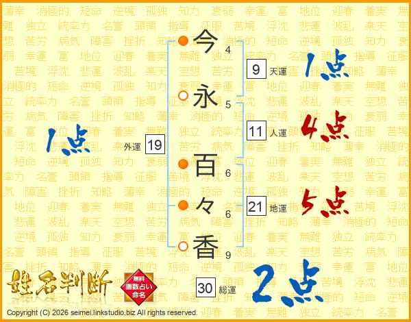 今(4画)永(5画) 百(6画)々(6画)香(9画)