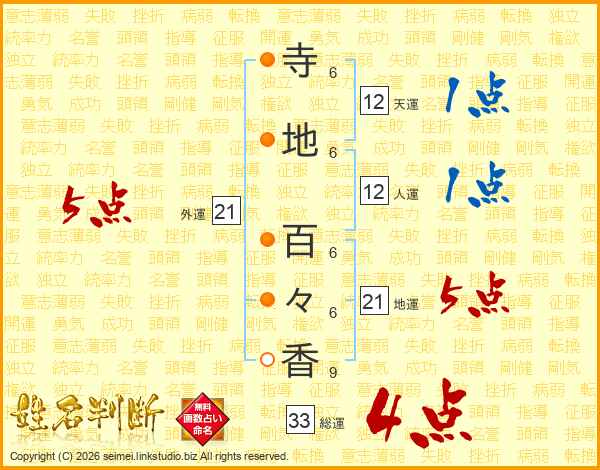 寺(6画)地(6画) 百(6画)々(6画)香(9画)