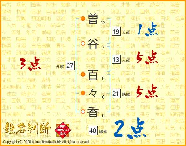 曽(12画)谷(7画) 百(6画)々(6画)香(9画)