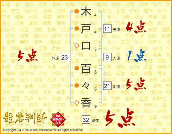 木(4画)戸(4画)口(3画) 百(6画)々(6画)香(9画)