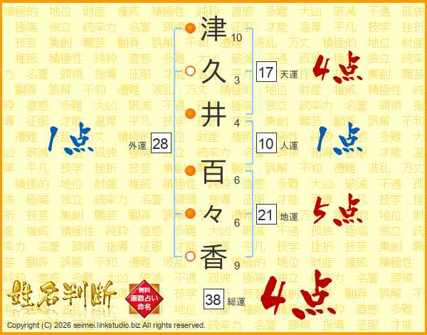 津(10画)久(3画)井(4画) 百(6画)々(6画)香(9画)