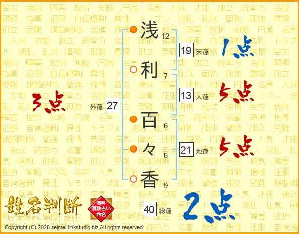 浅(12画)利(7画) 百(6画)々(6画)香(9画)