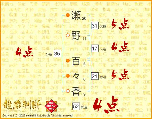 瀬野百々香さんの総運は52画の4点!
