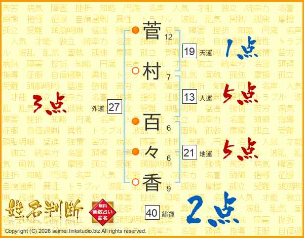 菅(12画)村(7画) 百(6画)々(6画)香(9画)