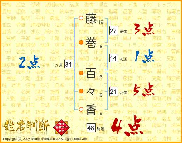 藤(19画)巻(8画) 百(6画)々(6画)香(9画)