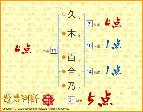 久木百合乃さんの総運は21画の5点!