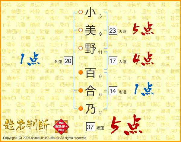 小(3画)美(9画)野(11画) 百(6画)合(6画)乃(2画)
