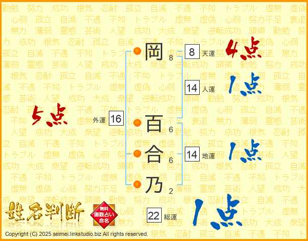 生活面を象徴する運勢です。外部から受ける影響力を表し、結婚運、家庭運や職場、環境への順応性を表します。総運から人運を引いた画数。姓や名が1文字の場合を除く。