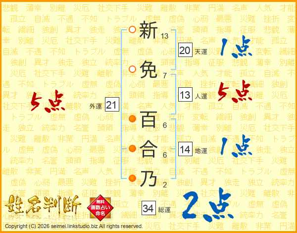 生活面を象徴する運勢です。外部から受ける影響力を表し、結婚運、家庭運や職場、環境への順応性を表します。総運から人運を引いた画数。姓や名が1文字の場合を除く。