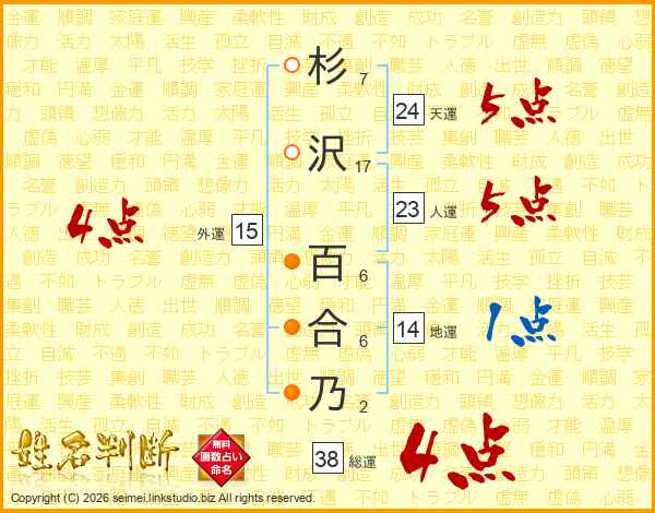 杉(7画)沢(17画) 百(6画)合(6画)乃(2画)
