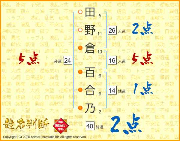 田(5画)野(11画)倉(10画) 百(6画)合(6画)乃(2画)