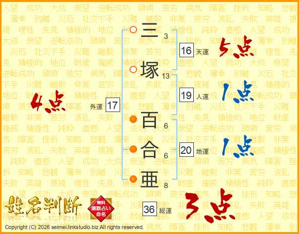 三塚百合亜さんの総運は36画の3点!