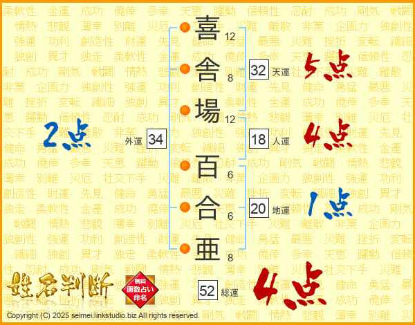 喜(12画)舎(8画)場(12画) 百(6画)合(6画)亜(8画)