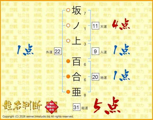 坂(7画)ノ(1画)上(3画) 百(6画)合(6画)亜(8画)