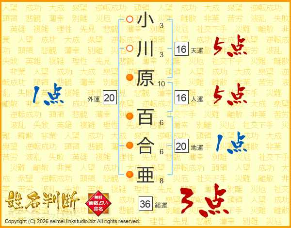 生活面を象徴する運勢です。外部から受ける影響力を表し、結婚運、家庭運や職場、環境への順応性を表します。総運から人運を引いた画数。姓や名が1文字の場合を除く。