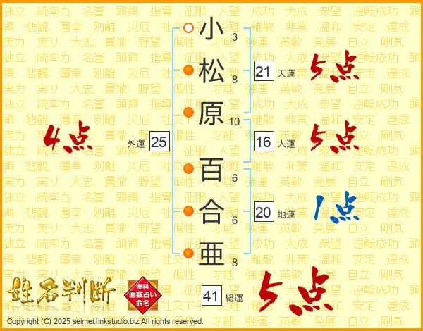 生活面を象徴する運勢です。外部から受ける影響力を表し、結婚運、家庭運や職場、環境への順応性を表します。総運から人運を引いた画数。姓や名が1文字の場合を除く。