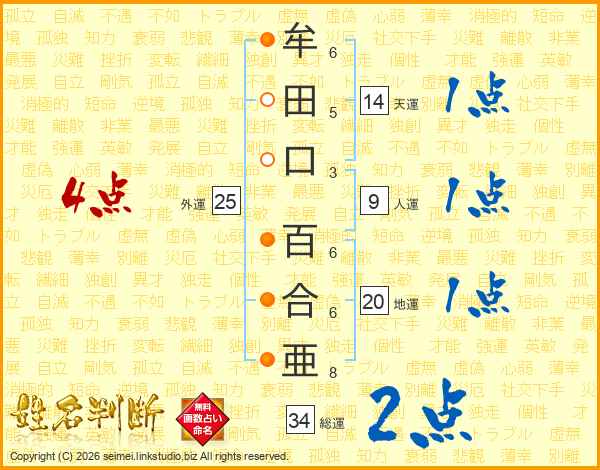 生活面を象徴する運勢です。外部から受ける影響力を表し、結婚運、家庭運や職場、環境への順応性を表します。総運から人運を引いた画数。姓や名が1文字の場合を除く。