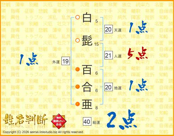 白(5画)髭(15画) 百(6画)合(6画)亜(8画)