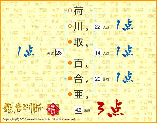 荷(11画)川(3画)取(8画) 百(6画)合(6画)亜(8画)