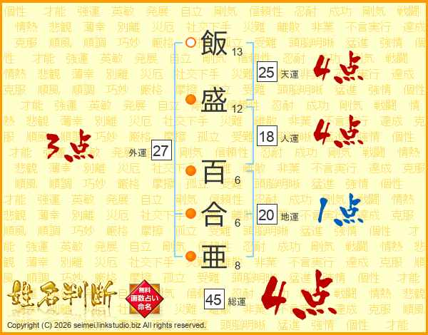 飯(13画)盛(12画) 百(6画)合(6画)亜(8画)