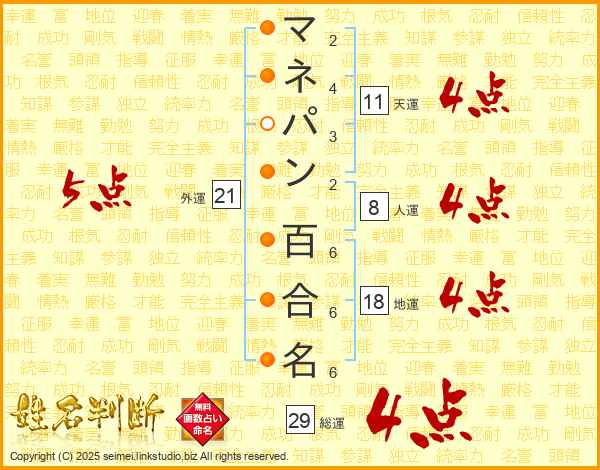 マ(2画)ネ(4画)パ(3画)ン(2画) 百(6画)合(6画)名(6画)