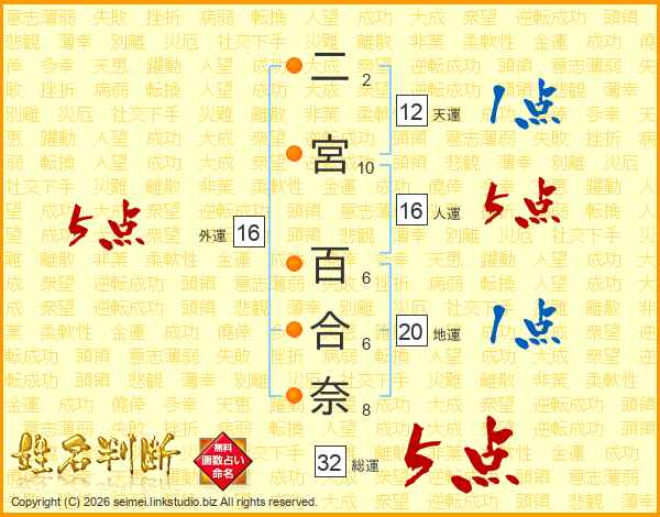 二宮百合奈さんの総運は32画の5点!