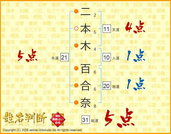 二(2画)本(5画)木(4画) 百(6画)合(6画)奈(8画)