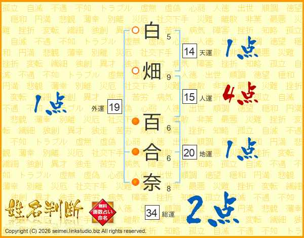 白(5画)畑(9画) 百(6画)合(6画)奈(8画)