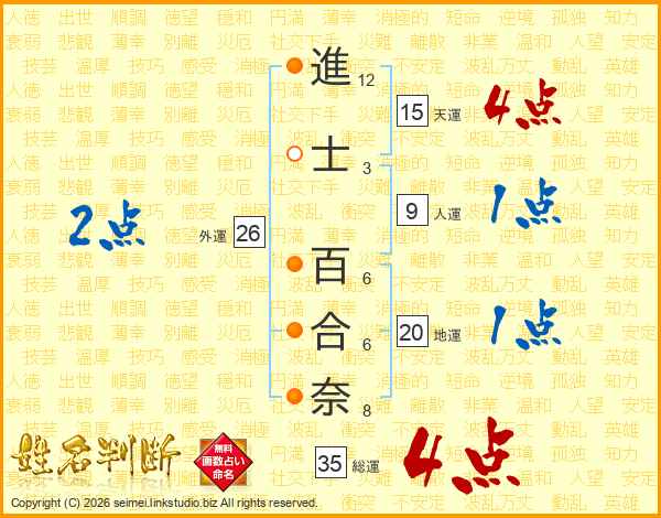 進(12画)士(3画) 百(6画)合(6画)奈(8画)