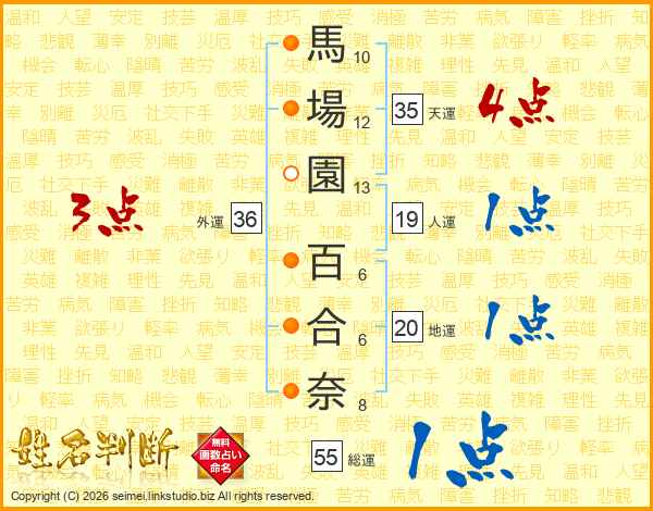 馬(10画)場(12画)園(13画) 百(6画)合(6画)奈(8画)