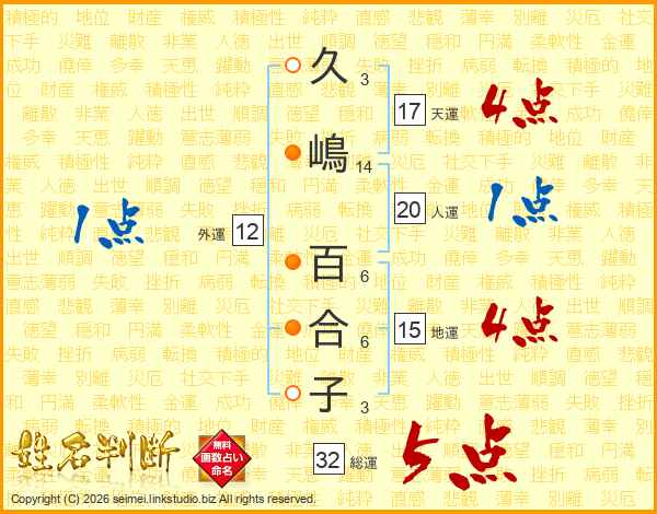 久嶋百合子さんの総運は32画の5点!